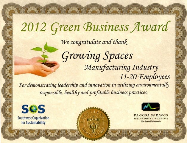On January 19th, 2013, Growing Spaces was privileged to be awarded the “Green Business of the Year” by the Pagosa Springs Area Chamber of Commerce and the Southwest Organization for Sustainability. We stood among many other businesses in our small community who demonstrate the need to do things differently. This honor came out of our goal last year to expand our focus on education to describe the LIFESTYLE THAT INCLUDES a Growing Dome. Udgar and I have lived that lifestyle now since the late seventies.