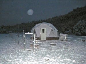 Congratulations to Neena Cocke Wagnon on winning February’s Dome of the Month contest with this awe-inspiring, fuchsia-cloud photo of her 26′ Growing Dome Greenhouse in New Mexico. It seems the clouds themselves are wrapping around the spherical shape of the greenhouse. Neena is so lucky to live in the Southwest where such skies are possible.