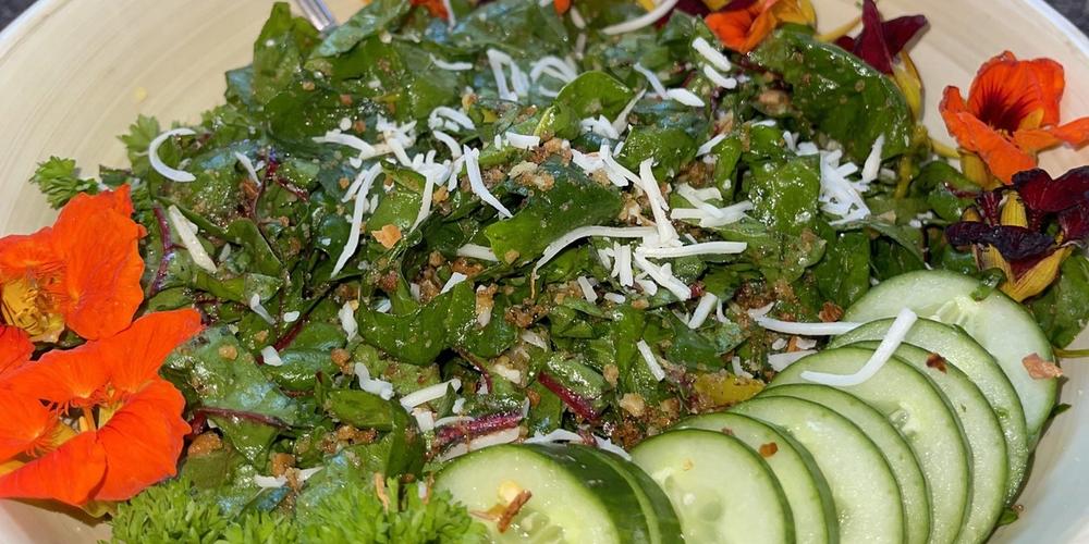 Add the parmesan and bread crumbs and continue tossing until the chard is thoroughly coated. Garnish with whatever your heart desires or whatever is extra in the garden. We used fresh cucumber, parsley, and edible flowers. Enjoy!