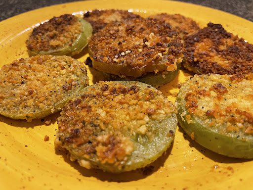 Begin by slicing the green tomatoes about a quarter of an inch thick. Add garlic, onion powder, salt, pepper, and Cajun spice in a mixing bowl and crack eggs in. Whisk until thoroughly combined. Bread the tomatoes, get a plate, and place breadcrumbs on a plate. Add smoked paprika, dried parsley, garlic powder, onion powder, pepper, and Tony Chachere‘s Cajun spice. Coat Completely. Take a large skillet and heat your oil to medium-high heat. The pan is perfect when you place your first tomato in, and it sizzles. Allow sautéing for 5 to 6 minutes or until golden brown, then flip and cook the reverse side for another 5 to 6 minutes. Place a few paper towels on a serving dish to let some of the oil wick into the paper towel. Enjoy with your favorite protein, for example, a ground chicken burger or a vegetarian entrée. Serve HOT!