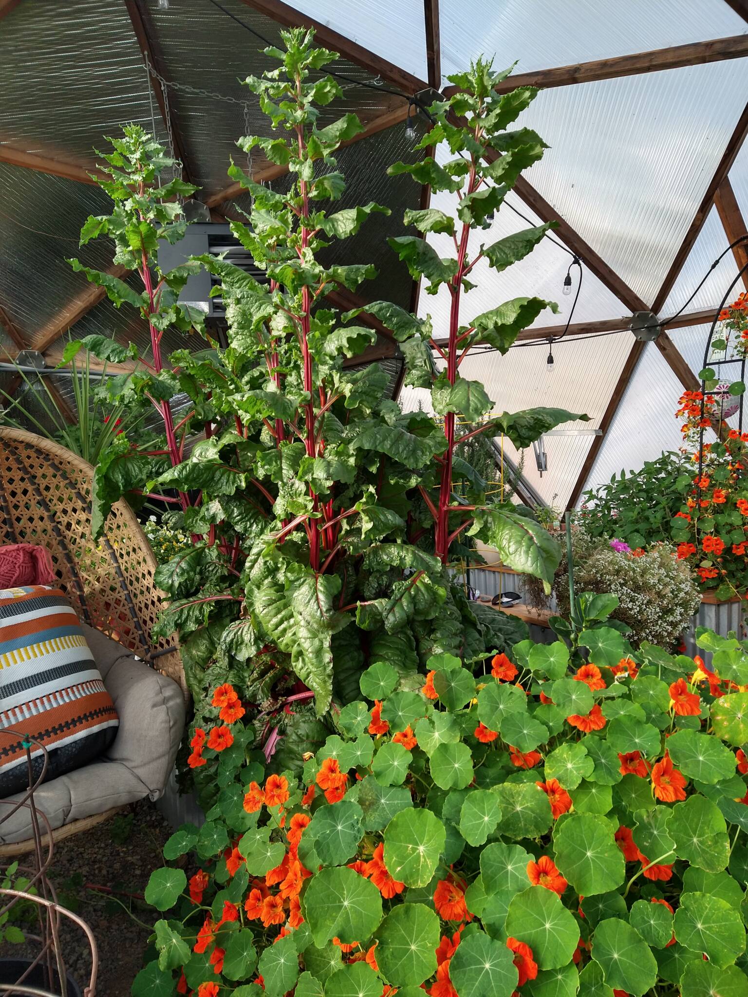 Chard is typically ready to harvest in 50-60 days when it’s close to 12” tall. Snap off the glossy, outer leaves and it will continue to grow. It’s best to pick chard in the early morning or evening as it can wilt if harvested in the heat of day and it’s less bitter when the weather is cooler. Chard is crunchier than spinach and more tender than kale so it makes a wonderful addition to a fresh salad, especially young chard as it is sweet. Try grilling or roasting the stems as a substitute for asparagus. It is also used in cooking and may be blanched and frozen the same as spinach. If you’re growing it as an ornamental in your dome let us know if it gets taller than this 5 foot tall chard in Leslie and Tommy Kearney’s dome!