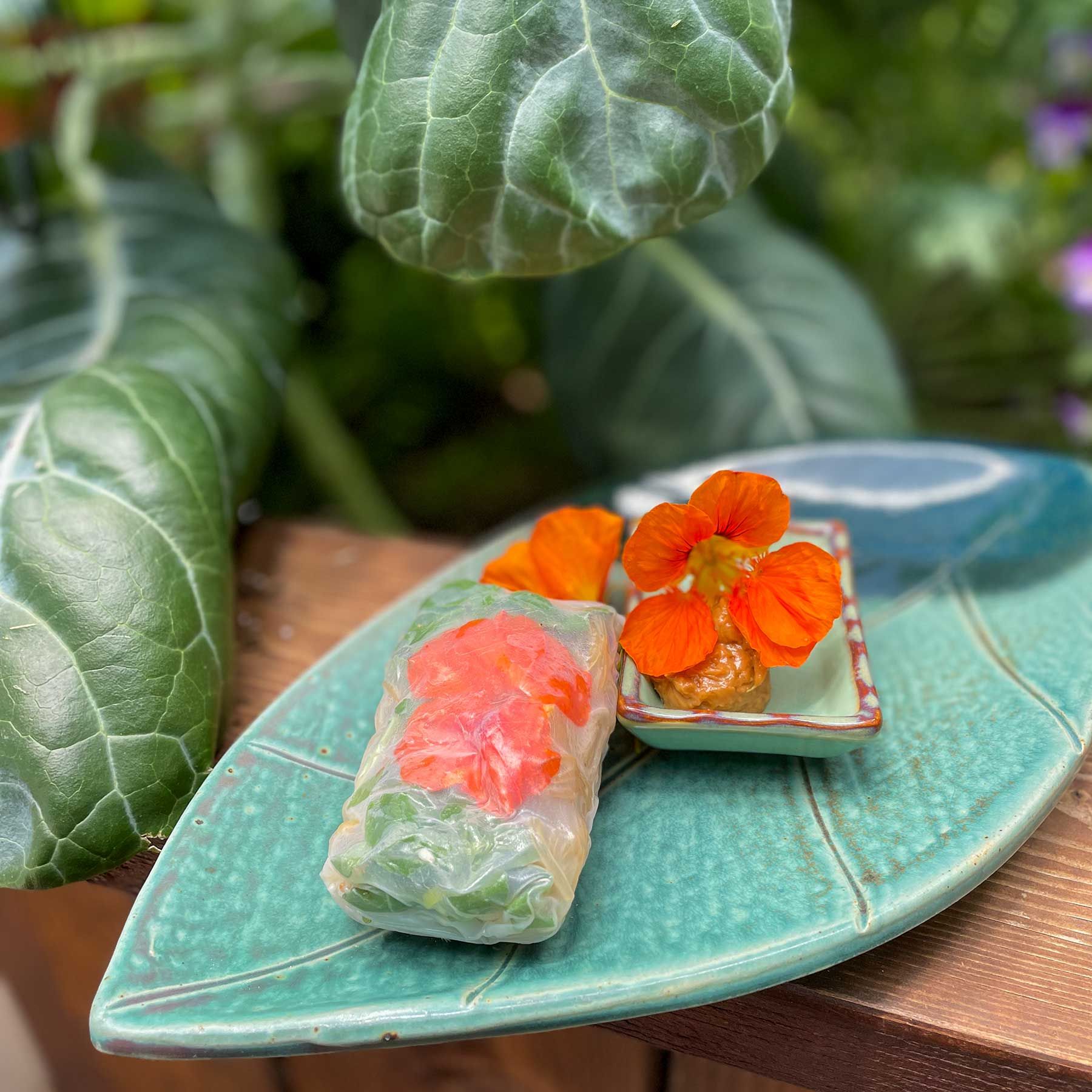 This bright, satisfying, yet light lunch keeps you going through your afternoon, or you can use it as an appetizer to a favorite Thai dinner entree or even pho. Nasturtium spring rolls with Thai peanut sauce are perfect for any warm-weather meal. Easy to make, the nasturtium packs an unexpected punch in a spring roll. They are so pretty you may not want to eat them, but they are equally delicious!