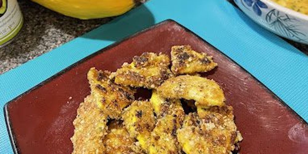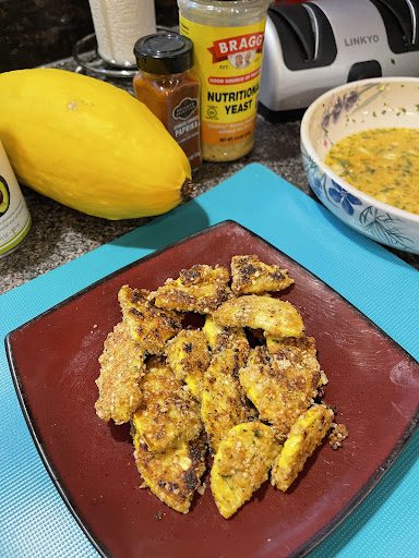Make an egg wash, crack your eggs into a large mixing bowl, and whisk. Dice the garlic and add to the eggs. Add half of the seasoning- paprika, garlic powder, pepper, nutritional yeast, parmesan, and salt. Whisk thoroughly to ensure everything is distributed evenly. Prepare your quinoa flake breading by putting the flakes on a large plate and spread out evenly. Use a dry whisk or fork to add the remaining seasoning and combine. Soak your squash pieces in the egg wash. Then toss pieces into the quinoa coating and bread evenly.